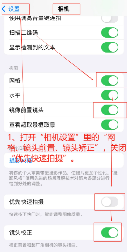 1、打开“相机设置”里的“网格拍镜头前置、镜头矫正”’,关闭优先快速拍摄。2、回到相机,轻往上滑找到“摄影风格按钮“滑动找到“高对比度”后再把色调”调到100,“色温调”到-100....